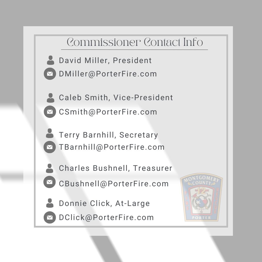 If you have any further questions, please call the Administration Office at 281-354-6666 or email the Office at Info@PorterFire.com